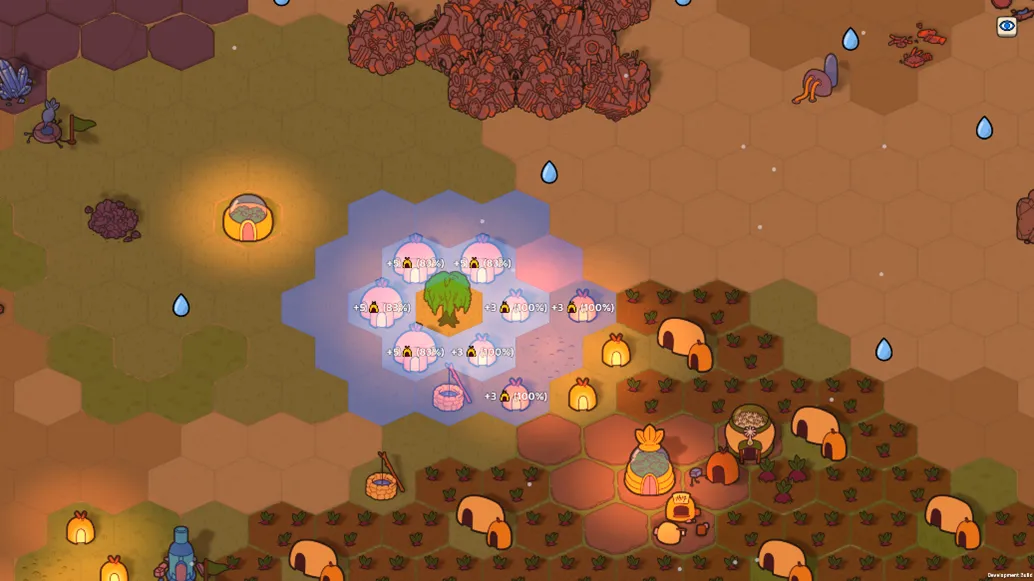 A: 最初构思这款游戏时,它的体量要小得多,玩法是围绕着构建一套农作物卡组展开——玩家在沙漠地图上排布农场,同类型的农场相邻摆放可以获得加成。六边形地块和圆形农场的设计,在最早的原型中就已经存在了。