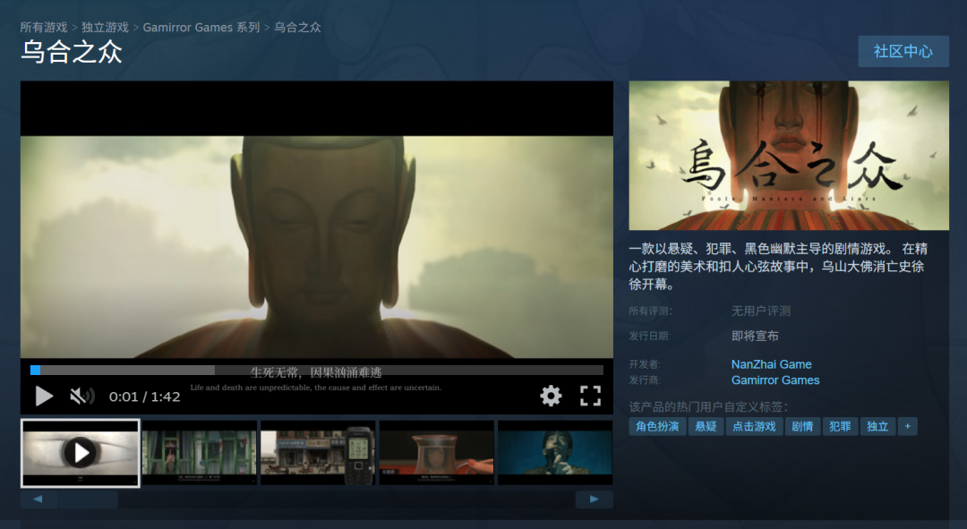 《乌合之众》是一款由大学生团队南斋工作室开发的中式悬疑剧情游戏。游戏以__架空的闽南陶瓷县城「乌山县」__ 为背景,围绕2009年乌山大佛突然消失的神秘事件展开叙事。玩家通过六名身份各异角色的视角,追溯大佛消失前一个月内的事件,揭示横跨半世纪的迷局。