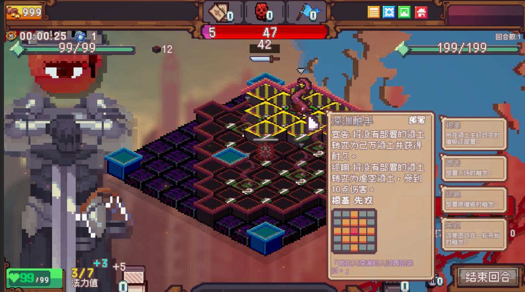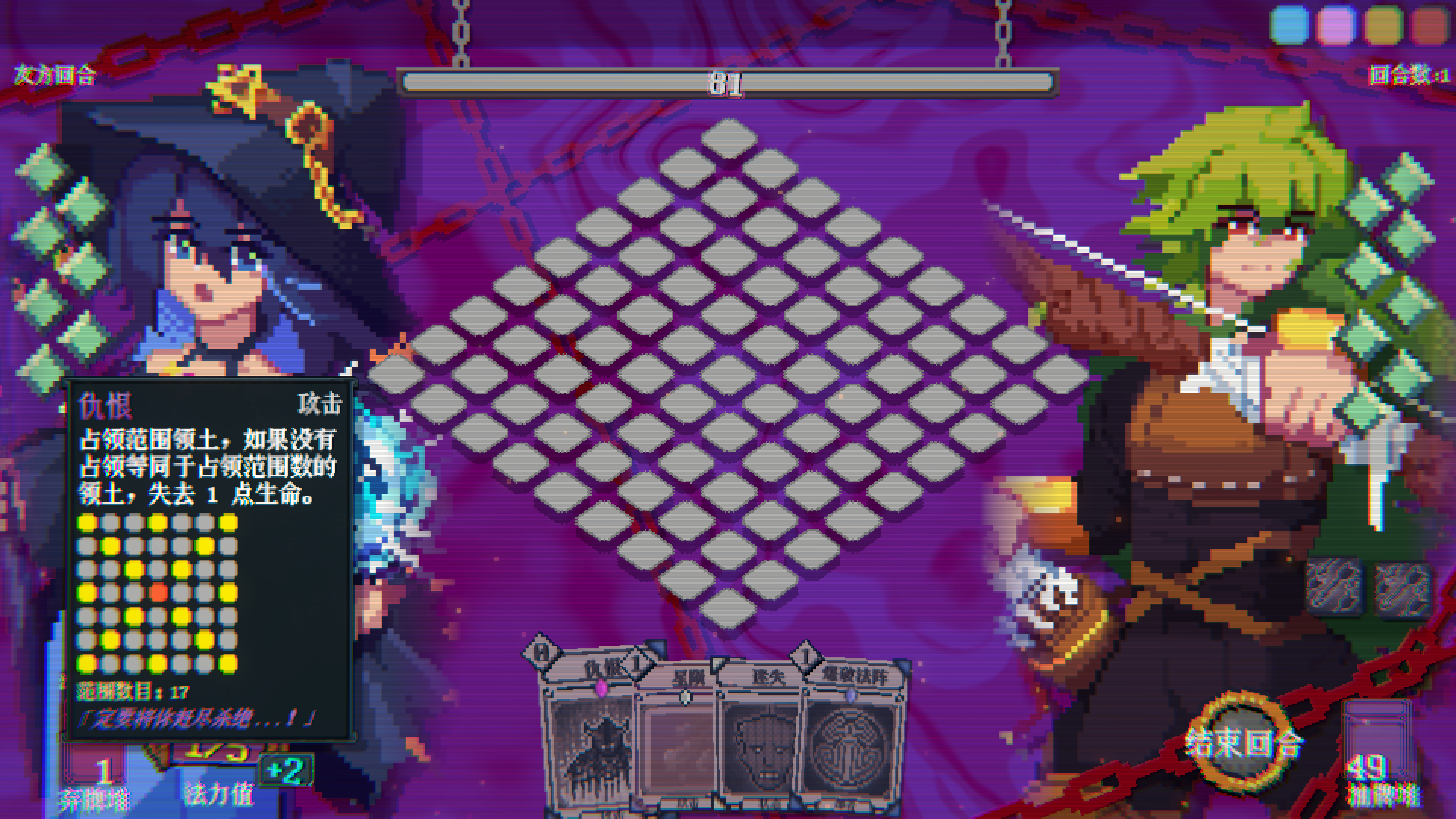 A:当然有的,一开始游戏的伤害结算仅仅比哪方的领土数值大,大的一方对少的一方造成1点伤害,玩家初始拥有8点生命值,战斗结束后恢复。但整体体验下来节奏实在是过于拖沓,因为解决最基本的小怪也起码要三四个回合,后来伤害结算我们就调整成了现在这样,但即便如此,玩家一回合也最多对敌人造成等同于当前领土数目的伤害,部分玩家在遇到数值压制的敌人时束手无策,也有部分玩家对于卡组构筑成型也不能一回合击败敌人表示不满,于是我们后面又再加入了“核心”机制,允许玩家对敌人直接造成等同于打出卡牌范围数目的伤害,这个我们测下来效果很好,一方面玩家可以更好的通过卖血击败敌人,另一方面也满足部分玩家OTK的爽快需求。