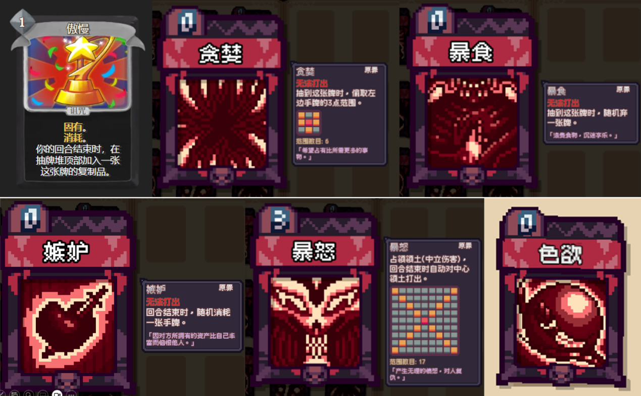A:在我们世界观设定参考的一部动画片《七色战记》中,每个颜色都隐喻着一种原罪,比如红色对应着暴怒,橙色对应着贪婪等等……而刚好,《杀戮尖塔》中有一张诅咒牌就叫“傲慢”——正是七宗罪之一,于是我们便把这类具有负面效果的卡牌按照七宗罪的思路设计:“贪婪”原罪牌会抢夺你左边手牌的范围、“暴食”会随机弃置一张手牌等。当然,如果利用得当,原罪牌也并非全是负面效果,你可以用“嫉妒”消耗不需要的手牌,也可以运用“暴怒”让你的对手吃点苦头。另外,如果敌人合你的胃口,你甚至还可以对他们使用“色欲”……?